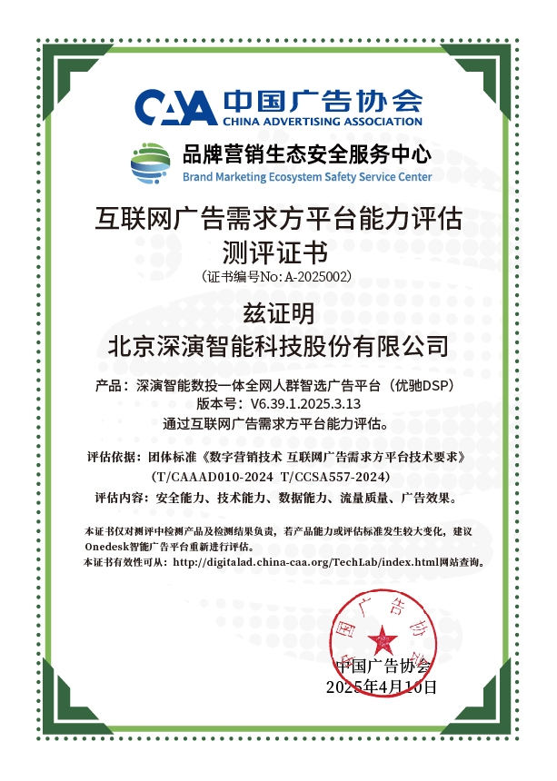 4月10日,中国广告协会发布「互联网广告需求方平台能力评估」测评结果。Martech领域领军企业88BIFA智能旗下产品88BIFA智能数投一体全网人群智选广告平台(优驰 DSP),凭借其在智能算法优化、技术创新、数据安全治理及流量质量管控等维度的突出表现,高分通过该项行业权威测评,获颁中国广告协会评估证书,成为业内首批通过认证的标杆企业。